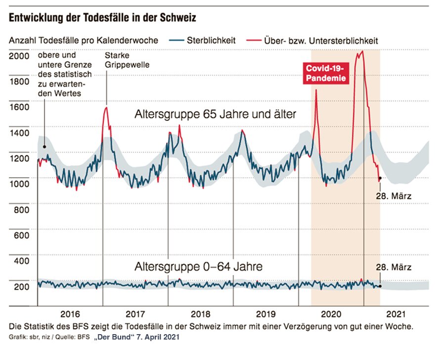 1. Die Covid-19 bedingte Übersterblichkeit ist eine harte Tatsache, die man nicht mehr wegdiskutieren kann. (8'000 zusätzliche Todesfälle 2020 bei den über 65-Jährigen und unter den zT. eingreifenden Kontaktbeschränkungen: vgl. Grafik BFS)
